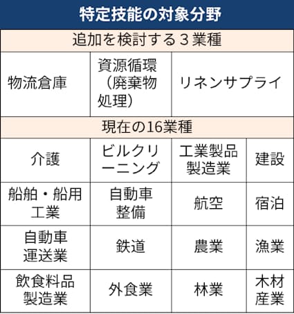 求める技術の習熟度合いから「1号」と「2号」に区別している。1号の場合は通算5年間、日本に滞在できる。2号に期限の上限はなく条件次第で家族の帯同も認められる。追加する3業種は1号から受け入れを始めるとみられる。